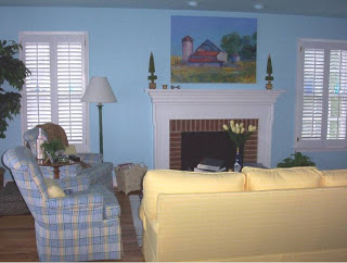 The walls of our family room are painted a turquois-y blue. The ceiling is painted a few shades lighter. All of the outlets and even the speakers in the ceiling were painted the same color so they just disappear from view. The yellow sofa provides a nice contrasting pop of color. On the coffee table I put some silk tulips in a pretty blue wine bottle from a local winery, Chateau Morrisette. Fake, I know, but they serve the purpose of tying in the color! In season they can be replaced with the real thing.