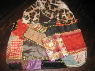 From the second crazy quilt, I made this purse (along with another, mentioned in a separate post) and attached leopard ribbon handles and a vintage orange rhinestone circle brooch.
