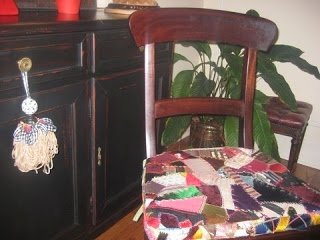 To secure the cushion to the seat, I had two narrow pieces of lime green fabric attached to the back of each cushion so they can be tied around the chair legs. The great thing about the crazy quilt is that it will match any color!