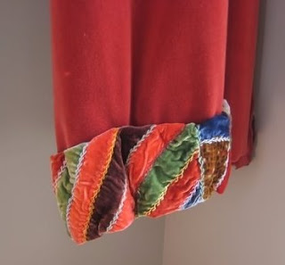 Also in the museum, I used a small section of crazy quilt to trim the hem of a red velvet valance. The quilt isn’t actually sewn on there; it’s just pinned and has stayed put for over 4 years! The valance itself was part of a theatre curtain in a former life (more on that in another post).