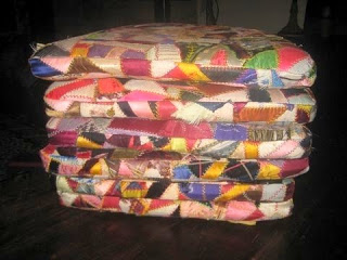 These are my dining room chair cushions. They are a colorful lot! I purchased the chairs and cushions at Crate & Barrel and then had the cushions covered with the crazy quilt.