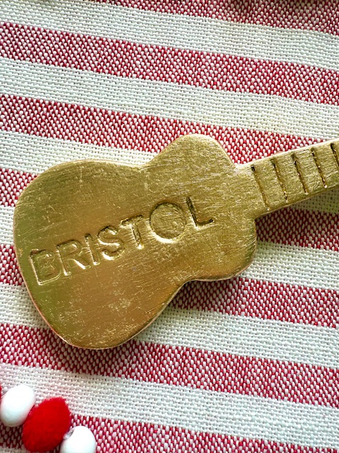 Gold leaf guitar Christmas ornament, handmade by Jane Evans. Engraved with “Bristol”, underscoring Bristol, Virginia’s place as the Birthplace of Country Music and home of the new Hard Rock Hotel & Casino. Could also be used as a paperweight. Comes with a stylish gold bow. 2″ x 5″