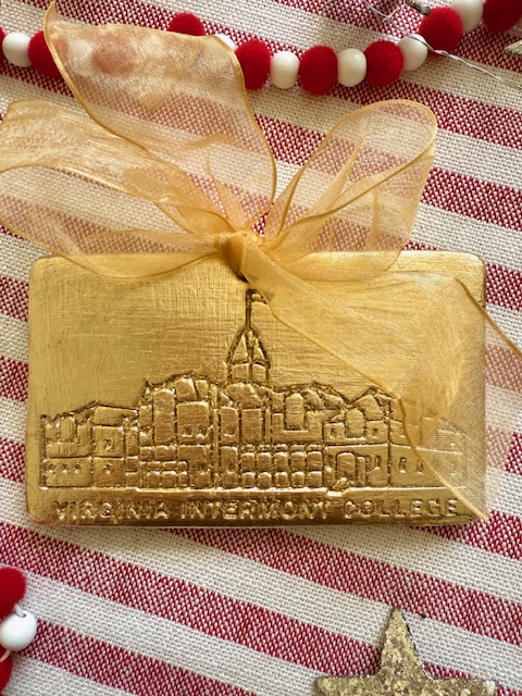 Gold leaf Virginia Intermont College Christmas ornament handmade by Jane Evans. Beautiful rendition of Main Hall on the campus of beloved college in Bristol, Virginia that closed in 2014. Could also be used as a paperweight. Comes with a stylish gold bow. 3″ x 5″